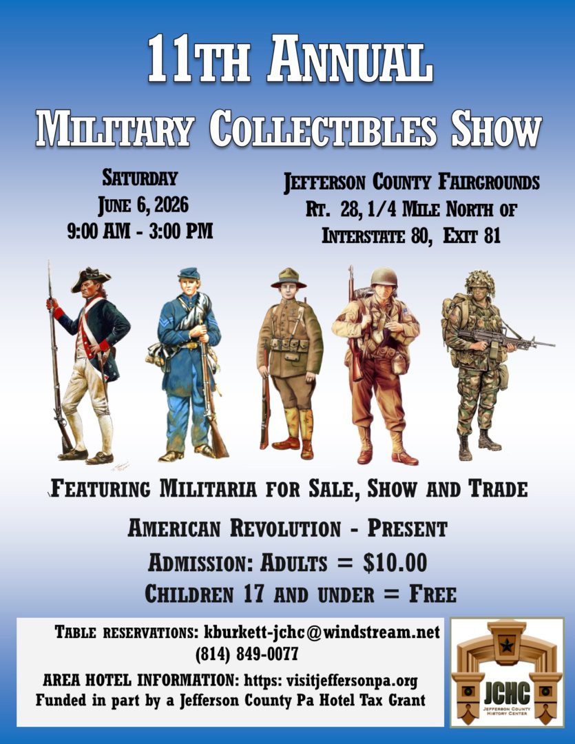 JCHS Presents the 11th Annual Military Collectibles Show Saturday June 6th, 2026,  9 am – 3 pm, at the Jefferson County Fairgrounds, Brookville, PA