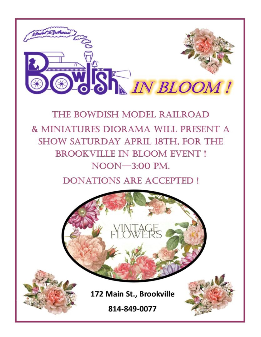 Date/Time Date(s) - April 18, 202612:00 pm - 3:00 pm Description Come see the Bowdish model railroad & miniatures diorama show Saturday April 18th during the Brookville in Bloom event! Noon – 3:00pm. Donations are accepted!
